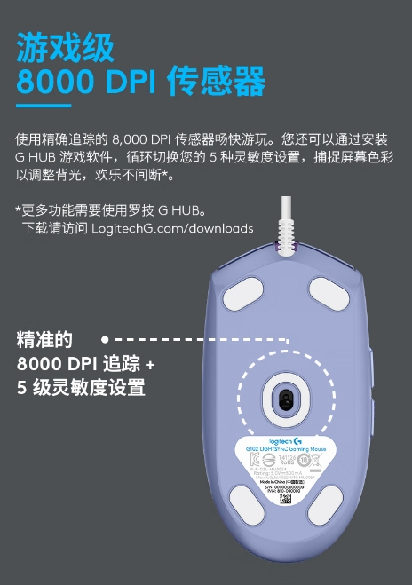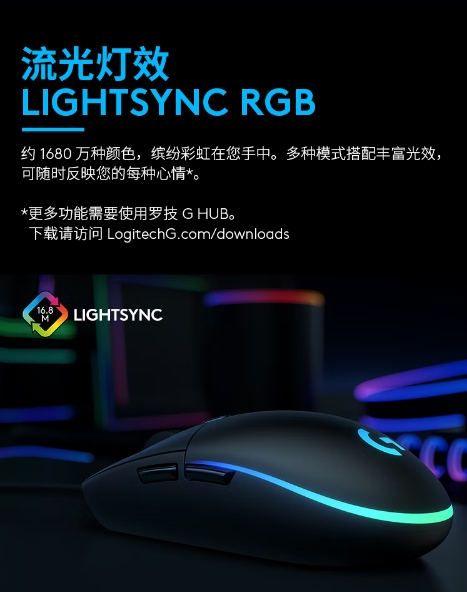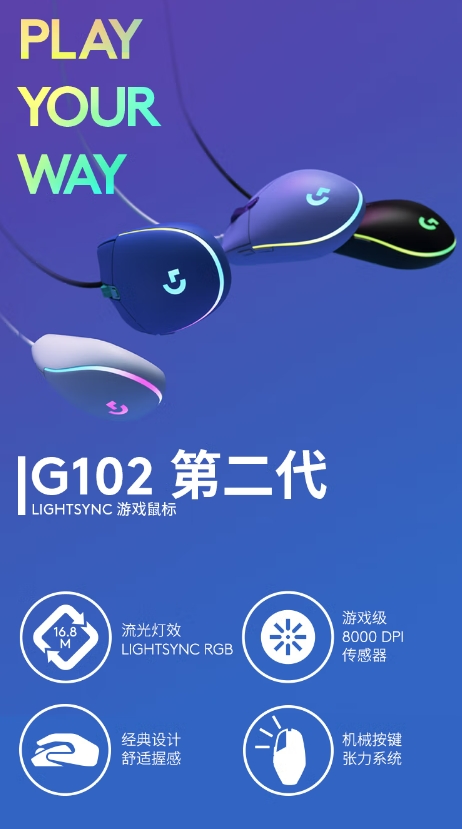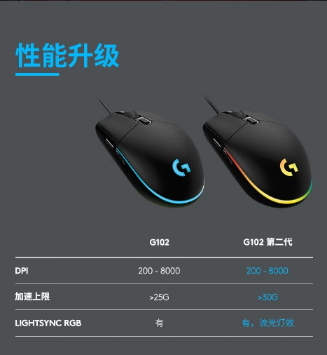 罗技(G)G102第二代游戏鼠标 RGB流光灯效鼠标 轻量化 游戏级8000DPI传感器 黑色 200-8000DPI